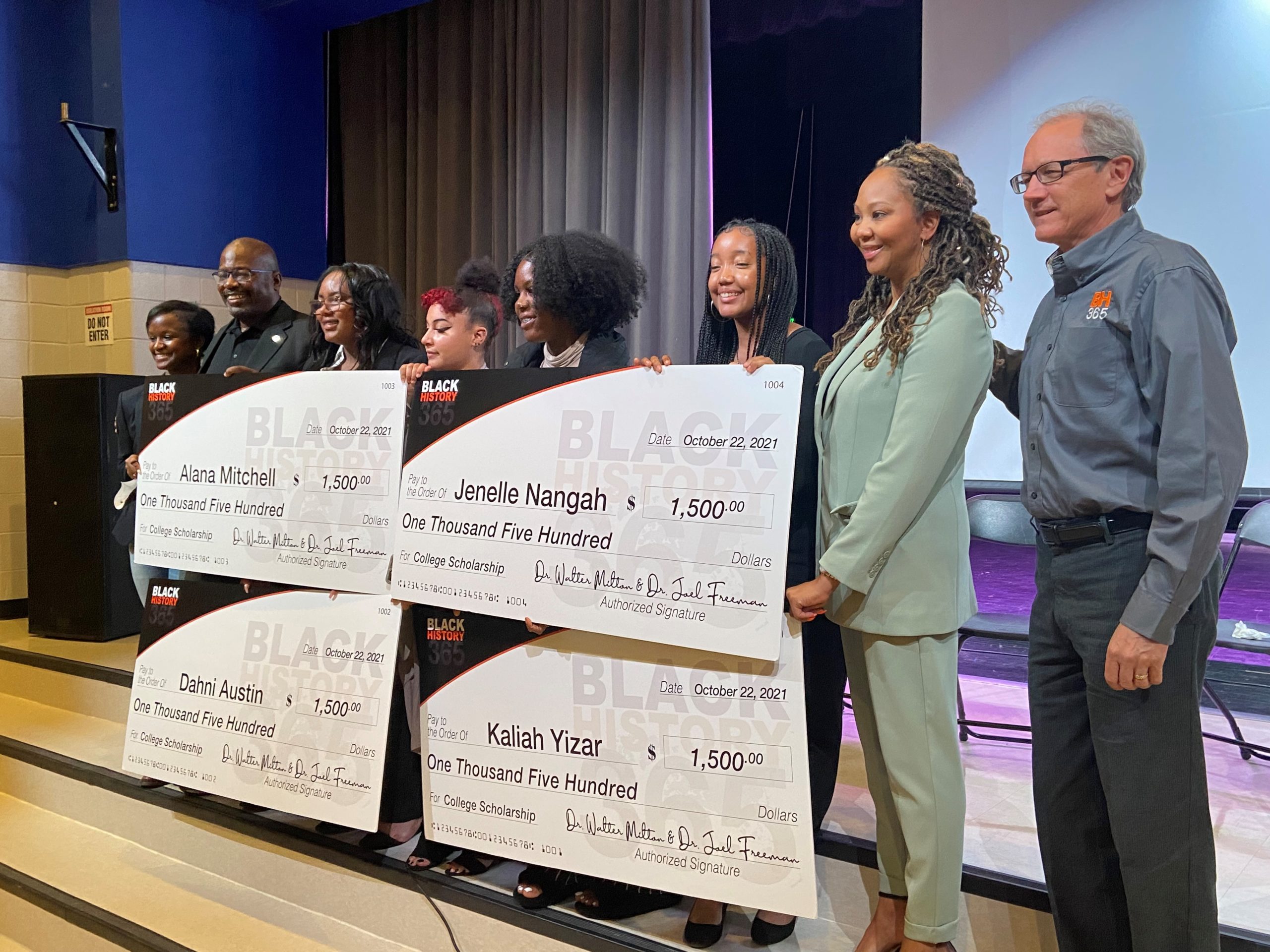 At the conclusion of the panel, Dr. Walter Milton and Dr. Joel Freeman, the creators of Black History 365, presented college scholarship checks to all students from the original podcast, Dahni Austin, Alana Mitchell, Jenelle Nangah and Kaliah Yizar.